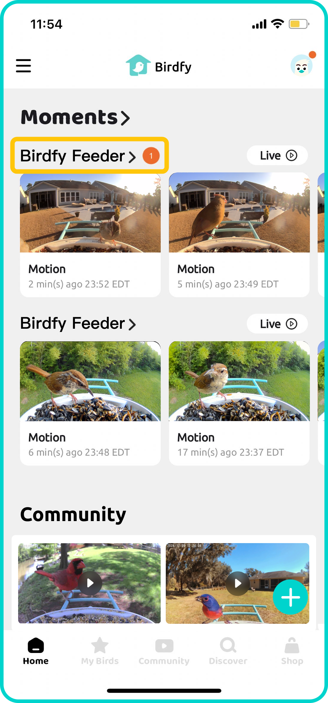 Once your Birdfy device is paired, simply wait for the first bird to visit! All detected activity will be shown in the Moment section on the Birdfy app's home screen.