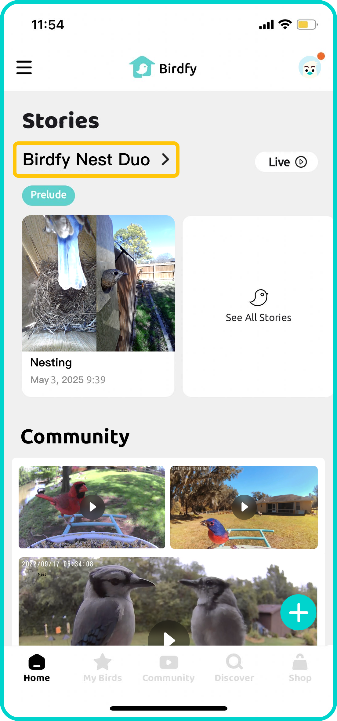 Once your Birdfy device is paired, just sit back and wait for your first feathered visitor. All footage from your birdhouse camera is uploaded to the cloud, where our AI automatically finds the bird moments and presents them to you in the Story section of the app. To view a Story in full, simply tap the name of your Birdfy device.